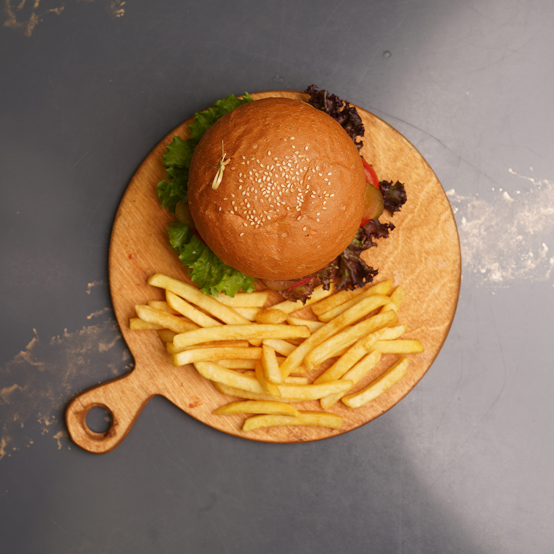 یک عدد برگر دست ساز گوشت گوساله ۱۶۰ گرمی، کاهو فرانسوی، گوجه فرنگی، خیارشور، سس مخصوص آمریکایی، سیب زمینی سرخ کرده، نان برگر گرد
