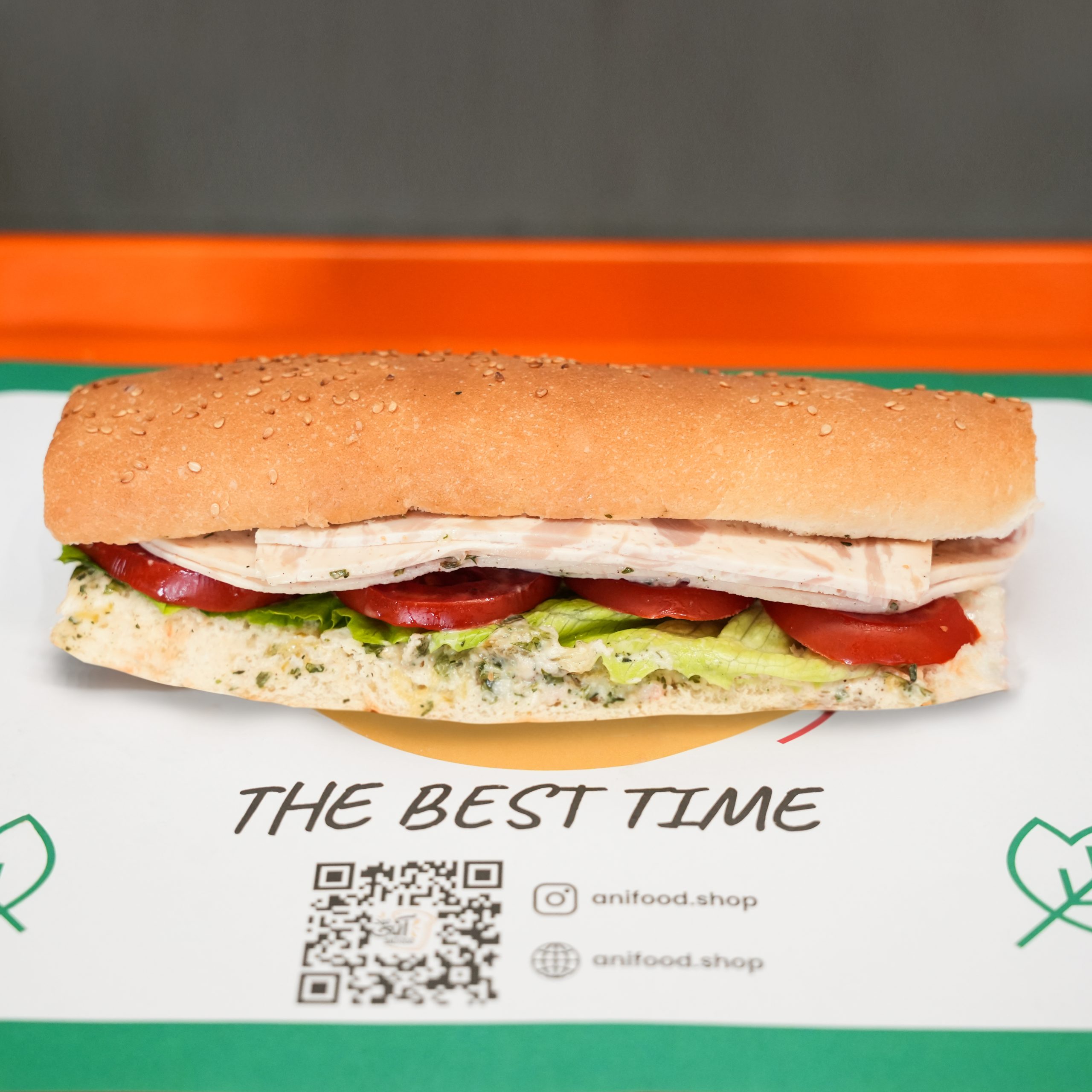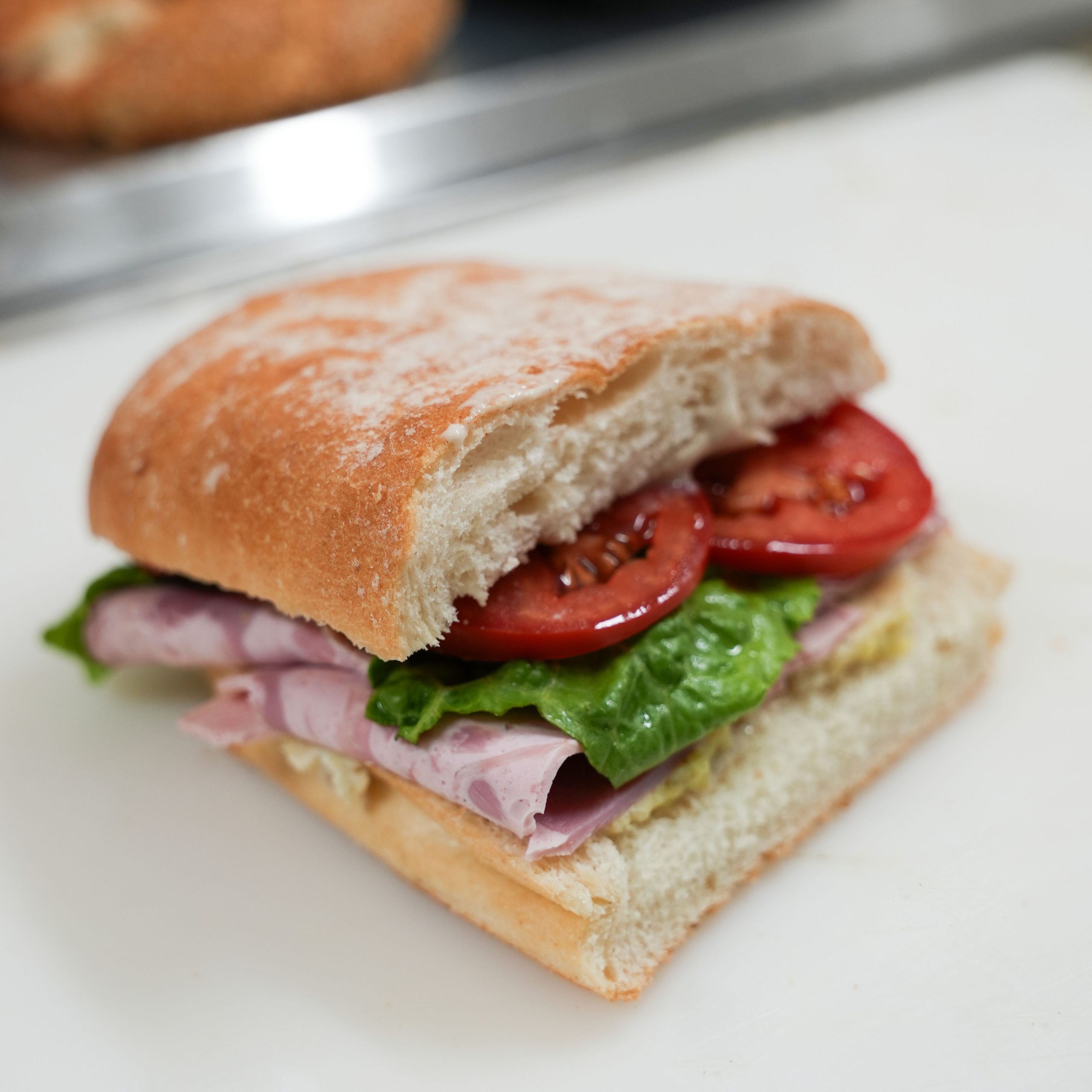۱۰۰ گرم ژامبون گوشت ۸۰%، کاهو، گوجه، مش پوتیتو (سیب زمینی، کره، خامه)، نان باگت