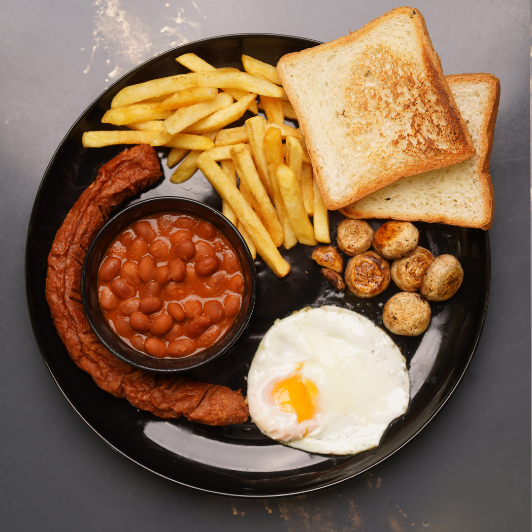 یک عدد نیمرو، قارچ، سوسیس هات داگ ۷۰ %، سیب زمینی سرخ کرده، خوراک لوبیا، ۲ تکه نان تست
