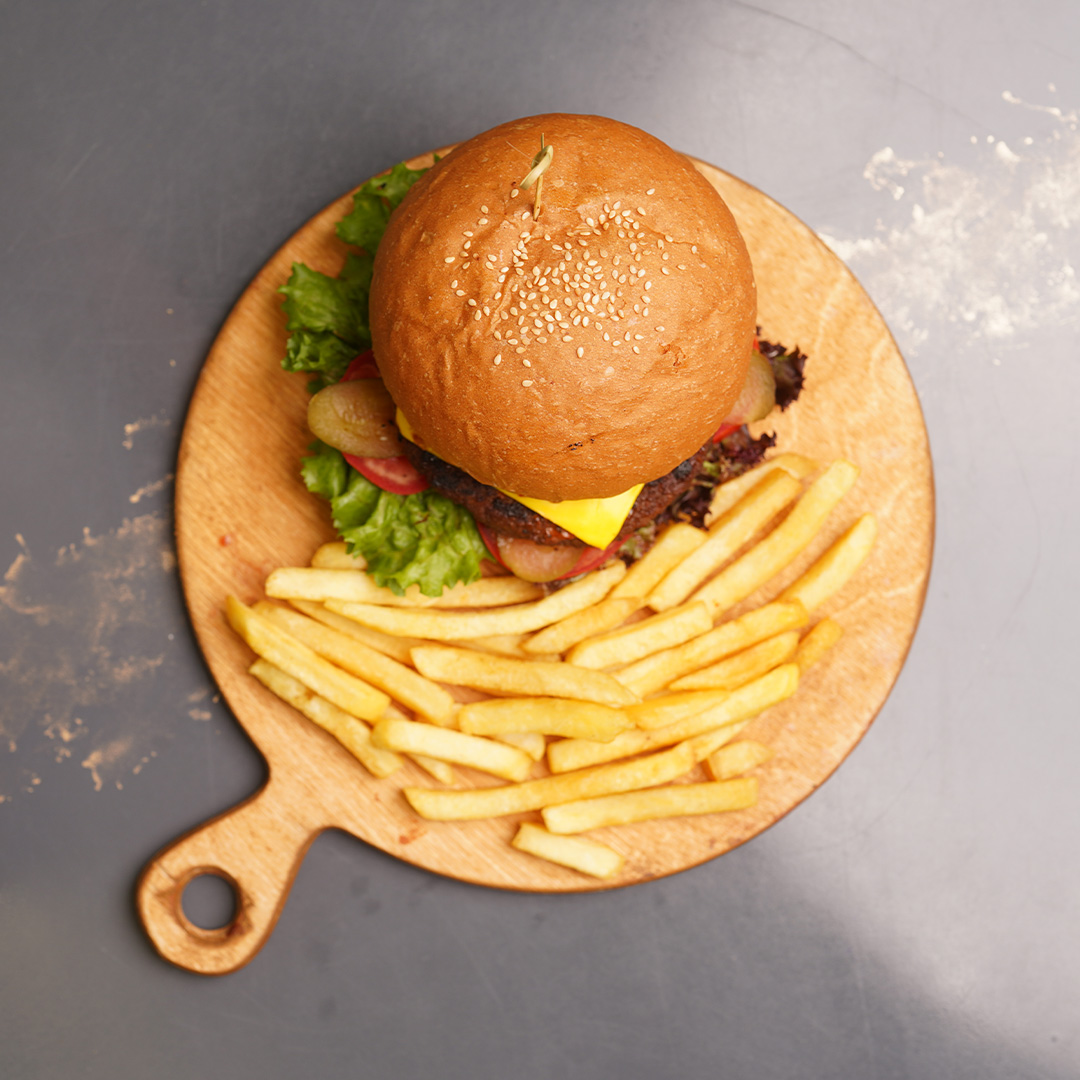 یک عدد برگر دست ساز گوشت گوساله ۱۶۰ گرمی، پنیر گودا، کاهو فرانسوی، گوجه فرنگی، خیارشور، سس مخصوص آمریکایی، سیب زمینی سرخ کرده، نان برگر گرد